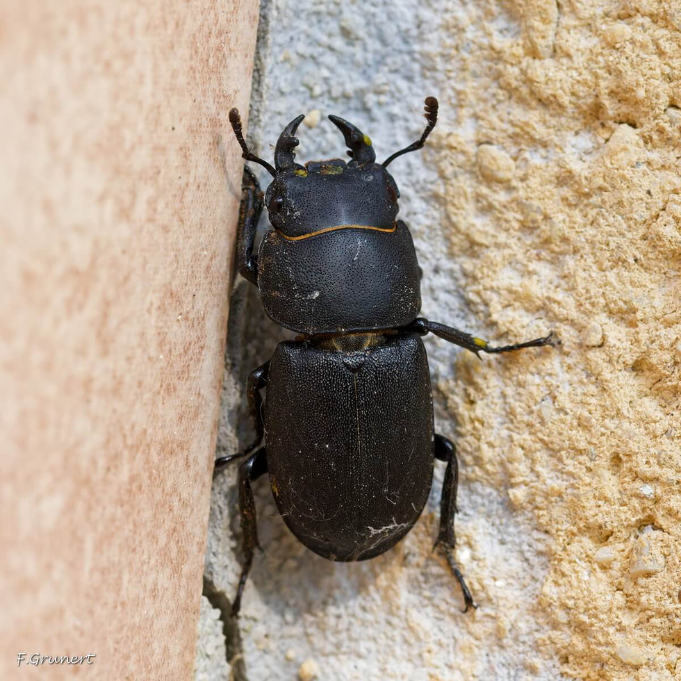 Femelle de Lucane cerf-volant Lucanus cervus sur les marches de la terrasse. D'où sort-elle ?