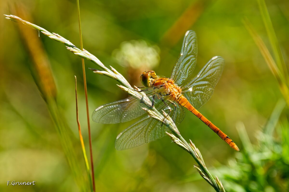 Belle population de Sympétrum striés Sympetrum striolatum, ♂ et ♀ tout juste émergés.